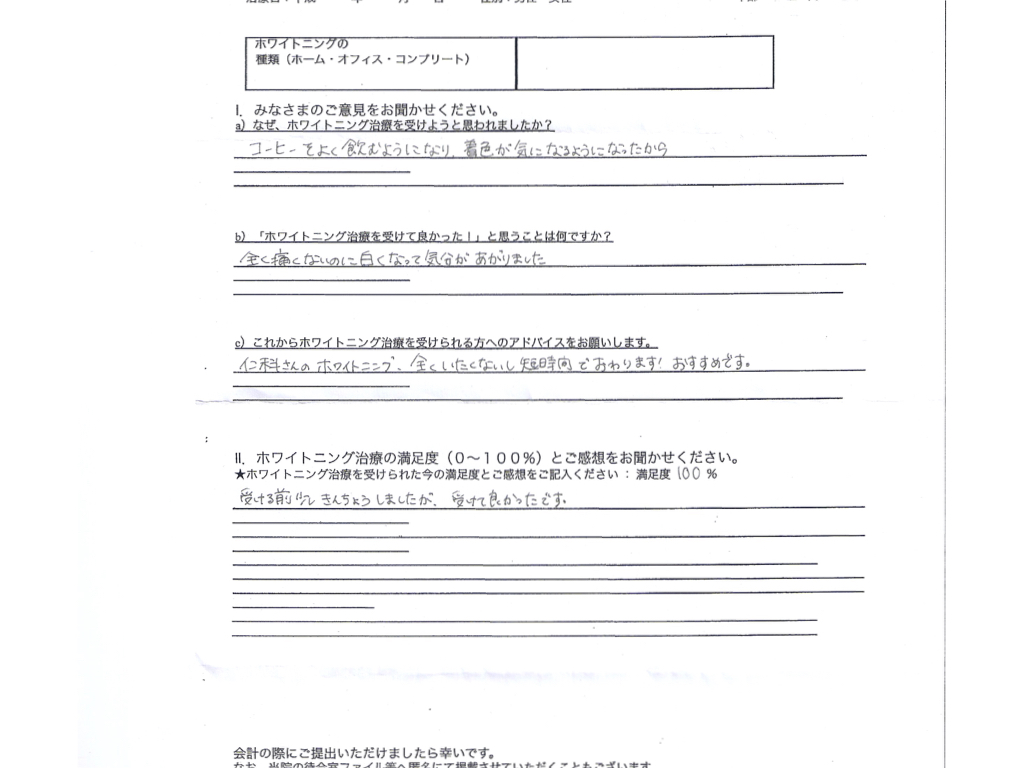 次に仁科式ホワイトニングのケースとアンケートをご覧ください